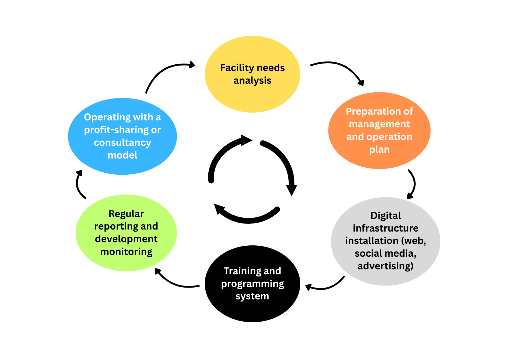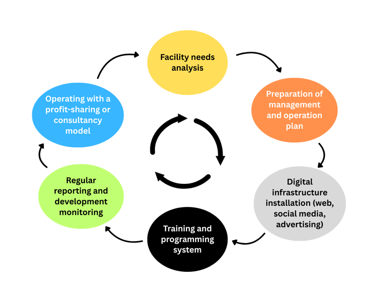 Full management of school sports facilities, private sports venues, or gyms, operated under a profit-sharing model.