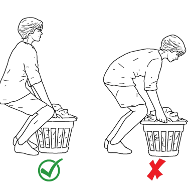 Squat down on one knee with your back straight. Grip the load firmly, and lift the weight by straightening your legs.