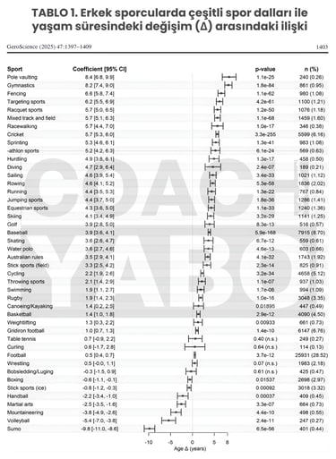 Şaşırtıcı Sonuçlar: Sumo güreşi (-9.8 yıl) ve voleybol (-5.4 yıl) gibi branşlar, referans popülasyona göre daha kısa bir yaşam süresiyle ilişkilendirilmiş.